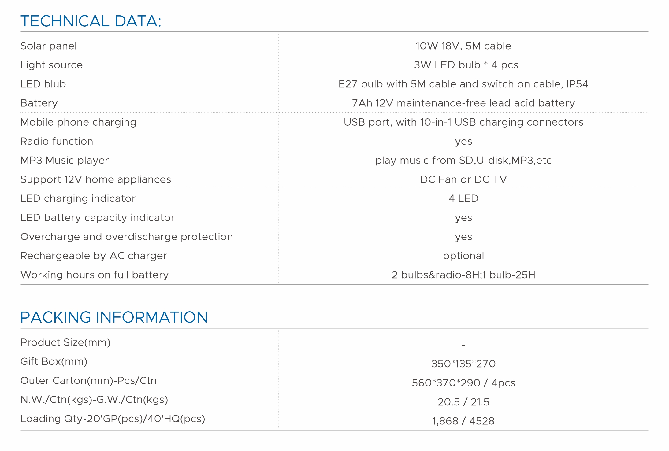 The 10W home solar power system is an efficient indoor lighting system. The system is easy to install, maintenance-free, plug and play, and can charge mobile phones and other devices. High-efficiency constant-current source LED energy-saving bulbs provide users with stable lighting. LED status display for battery charging and discharging, easy to monitor the battery status in real time. High energy density lithium ternary battery and high cycle life lithium iron phosphate battery, providing users with diversified choices. High-efficiency charge conversion technology and perfect protection functions of overcharge, overdischarge, overload, short circuit and overheat greatly extend the service life of the product.